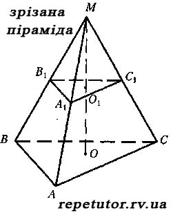 Площина, яка паралельна площині основи піраміди і перетинає її бічні ребра, відтинає від неї подібну їй піраміду, об'єми яких відносяться як куби їх висот. На рисунку піраміда МАВС подібна до піраміди МА1В1С1. Друга частина піраміди АВСА1В1С1 — це многогранник, який називається зрізаною пірамідою.